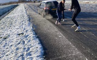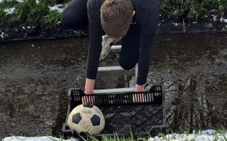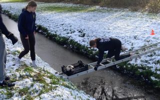 Als extraatje had Rutger een fierljepstok meegenomen. Wie wilde, mocht het proberen. Rutger deed het voor en ging met mooie, soepele techniek over de sloot. Jan Jelle volgde zijn voorbeeld en kwam ook soepel aan de overkant. Ilse durfde eveneens; het duurde even, maar… ze kwam bijna over de sloot. Haar voeten belandden tegen het talud, in de sloot.