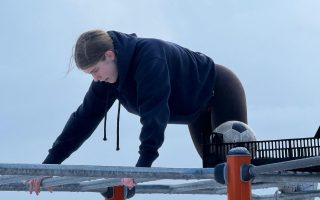 Om de handen warm te krijgen, werd in groepjes de bal met de hand hooggehouden. Na elk balcontact moest een pirouette worden gemaakt.