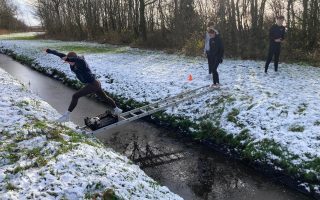 Daarna volgde de ladder-run. Met een ladder van vier meter lang moest een parcours worden afgelegd, met opnieuw die dekselse kist mét bal erop. De teams moesten hiermee zelfs een sloot oversteken. Eén team had daar wat moeite mee: de bal met kist belandde in het water.